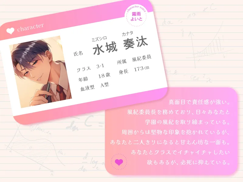 風紀委員の定例会後の議事録をまとめるあなたの元に、報告を済ませた奏汰が訪れる。