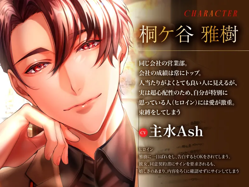 会社の帰り営業部・雅樹が一緒の会社の子から告白されるところを目撃してしまったヒロイン。物音を出してしまったせいで覗き見していた事がバレてしまう。少し話をし、雅樹の話(モテすぎるせいで若干女が苦手)や(でもいい子がいたら彼女がほしい)と聞いて、その場の勢いで告白してしまう。安易に彼女同意書という物にサインをしてしまったため、逃れられない激重愛が炸裂していく。