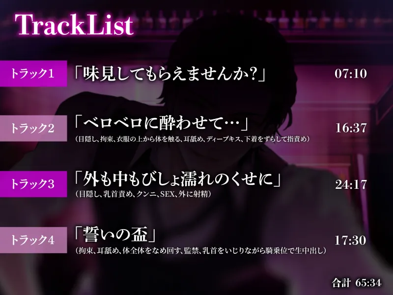 トラック2:ベロベロに酔わせて…(目隠し・拘束・衣服の上から体を触る、耳舐め、ディープキス、下着をずらして指責め):16:37