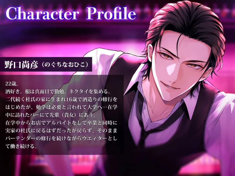 俺は新人ウエィター…「バーテンダー」の先輩に一目ぼれして同じ職場で働きながら弟子入りさせて貰う事になった。先輩(貴女)はシェイク姿が素敵で酒に強い…らしい。俺も酒好きで客として店に通ってからそのまま居ついてもう5年くらいになる。仕事は相変わらずウエィターだけどたまにシェイカーを握らせてもらって、ある程度のカクテルなら作れるようにはなってきた。