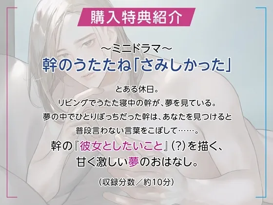 特典ミニドラマ『幹のうたたね「さみしかった」』(*性描写あり:胸舐め、自慰見せ(彼からの軽い指示あり)、正常位、耳舐め、中出し):13:18
