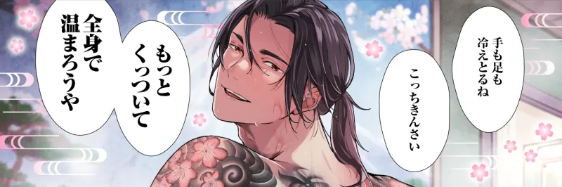 ・浴衣からチラ見えするもんもんが色っぽくてドキドキしていると「温めてあげるけぇ、こっちきんさい」お布団に寝転がり向かい合わせで密着