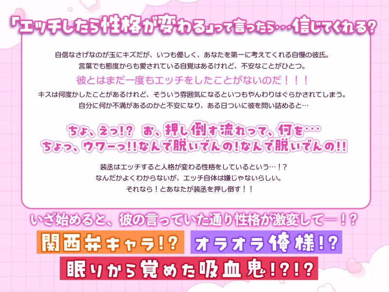 装丞はエッチすると人格が変わる性格をしているという…!?なんだかよくわからないが、エッチ自体は嫌じゃないらしい。それなら!とあなたが装丞を押し倒す!!いざ始めると、彼の言っていた通り性格が激変して―!?