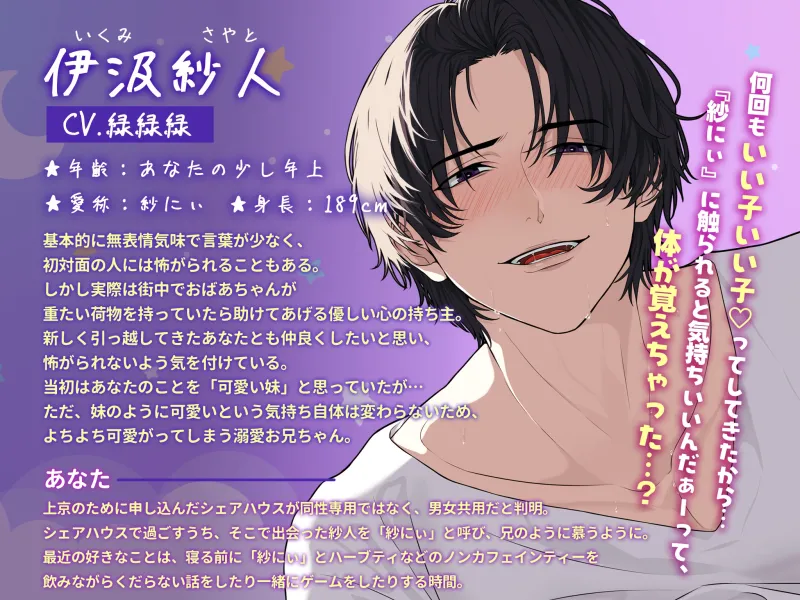 話を聞くと、あと三か月誰も住まなかったら、シェアハウスがなくなってしまうとのこと。せめて次の人が来るまで、と紗人に頼み込まれ、期限付きでそのシェアハウスに住むことに。生活にも慣れ、紗人のことは「紗にぃ」と呼ぶほどあなたにとってお兄ちゃん的な存在になっていた。しかしある日から、夢で「紗にぃ」に犯される夢を見るようになる。夢の中の「紗にぃ」は幼い子に話すような、甘やかしているような普段とは違う口調だった…