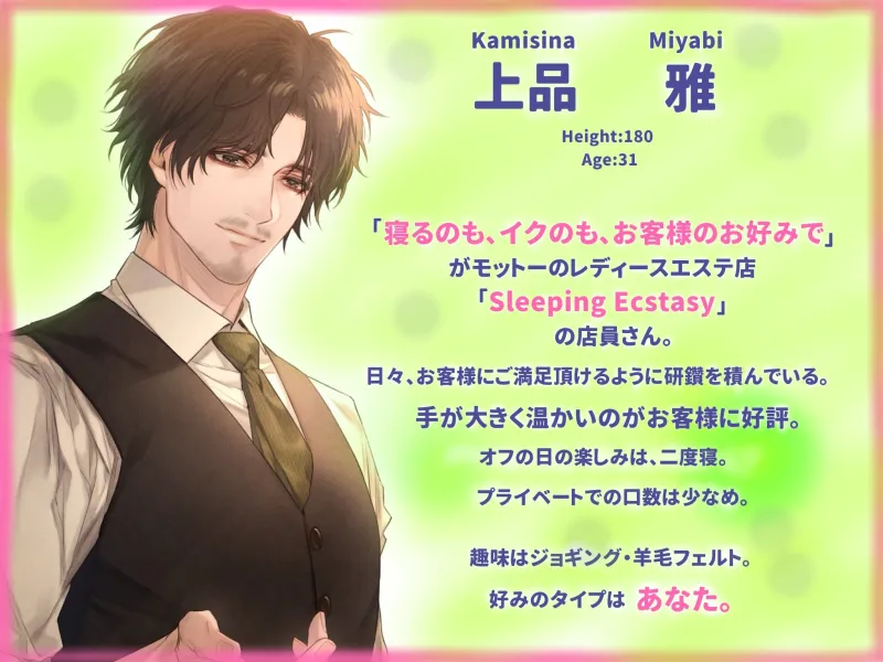 あなた:日々の疲れを癒しに、ムラムラした気持ちを満たされに「Sleeping Ecstasy」に来店したお客様。