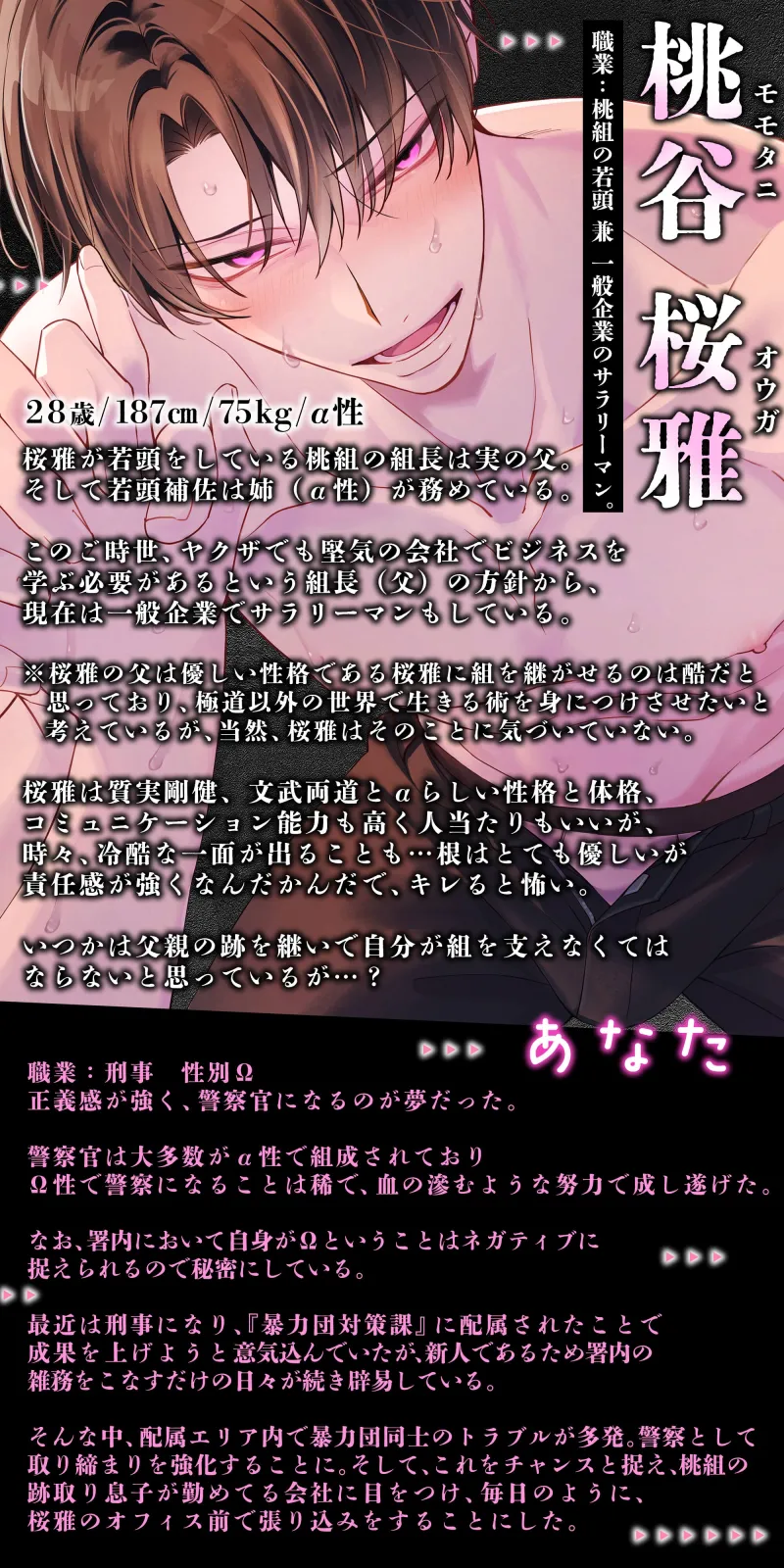 最近、刑事になり更なる成果を上げるべく地元極道、桃組の跡取り息子「桜雅(オウガ)」の検挙にターゲットを定めていた。